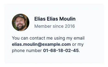 Dans notre scénario, on nous demande de développer un composant qui affiche une carte membre associative d'un personnage fictif aléatoire. À chaque chargement de page, le personnage affiché doit être différent. En plus de son nom et prénom, on nous fait la demande un peu farfelue d'afficher son second prénom (middle-name en anglais). On veut également afficher l'année depuis laquelle le personnage est membre du site, son email et son téléphone. Voici à quoi ressemblerait la carte membre :