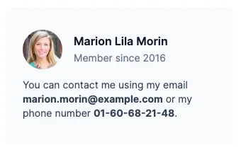Dans notre scénario, on nous demande de développer un composant qui affiche une carte membre associative d'un personnage fictif aléatoire. À chaque chargement de page, le personnage affiché doit être différent. En plus de son nom et prénom, on nous fait la demande un peu farfelue d'afficher son second prénom (middle-name en anglais). On veut également afficher l'année depuis laquelle le personnage est membre du site, son email et son téléphone. Voici à quoi ressemblerait la carte membre :