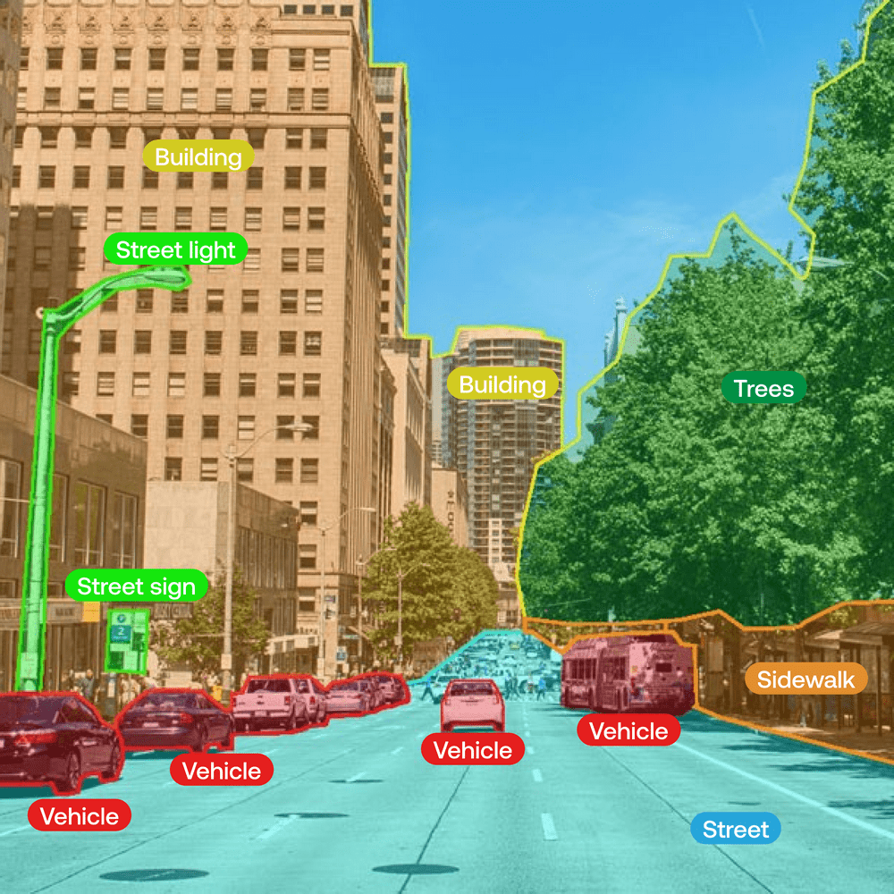 La segmentation sémantique vise à assigner automatiquement une catégorie – ou un masque – à chaque pixel d'une image, permettant ainsi de délimiter très précisément différentes zones. Un modèle de segmentation est tout particulièrement pertinent dans des domaines comme la cartographie de précision pour les systèmes de navigation ou l'analyse fine de tissus dans le secteur médical.